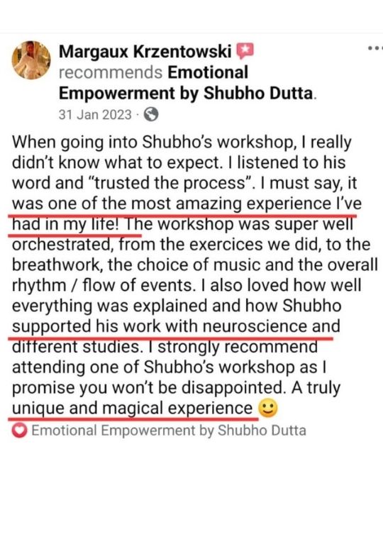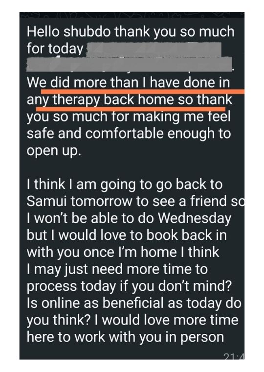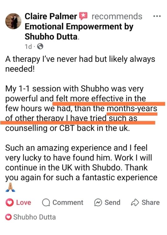 “Shubho had such a way of holding space and professionalism and such safety that I could relax and really trust the process and allow myself to go where it needed to for the healing I was really looking for.“